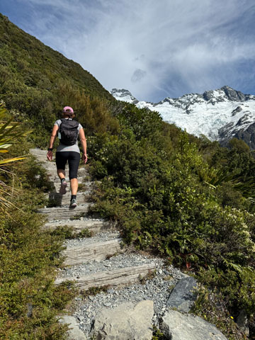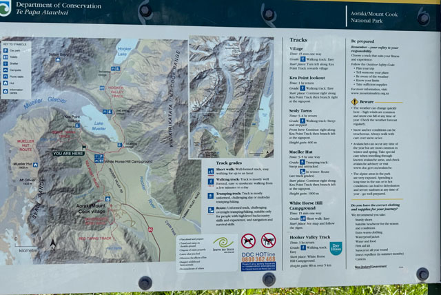 Au réveil, le campement est plus calme, tout le monde semble se préparer pour l’ascension de la Mueller Hut Trail: 9,5 km et 1095 mètres de dénivelé positif.