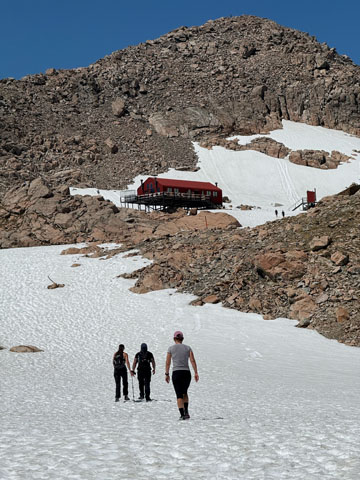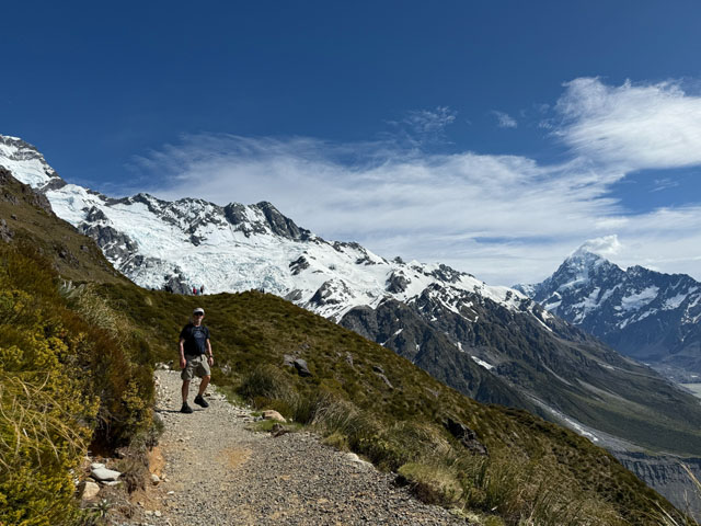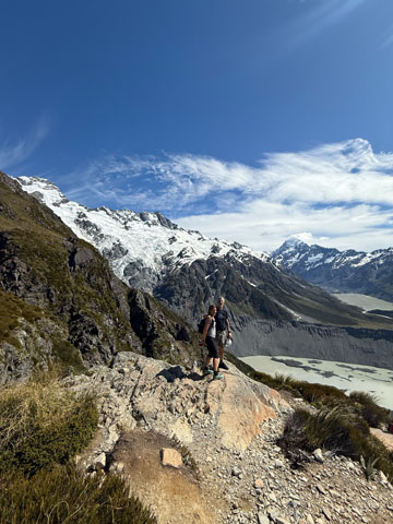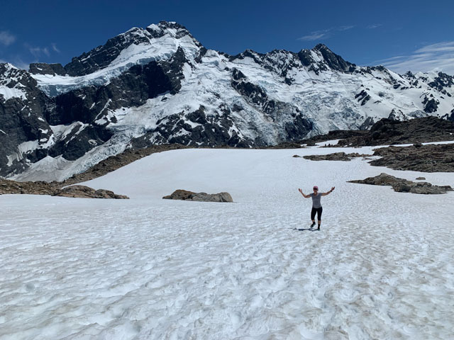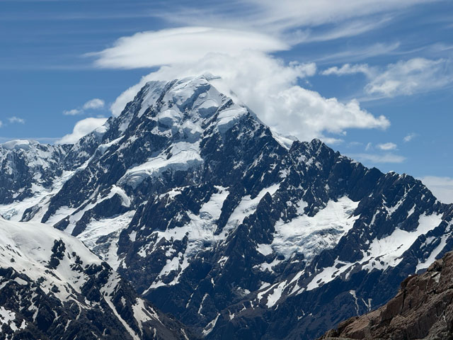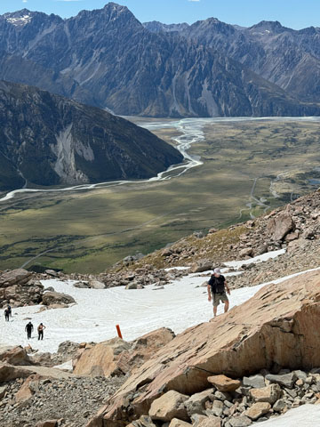 Après quelques secteurs enneigés, nous atteignons la hutte Mueller. Nous apercevons le glacier du même nom, le mont Cook et le lac Hooker. À quelques reprises, un bruit assourdissant annonce une avalanche au loin. C’est la première fois que nous sommes témoins de ce phénomène. Nous dînons au sommet puis entamons la descente avec un peu d’appréhension, nous sommes meilleurs grimpeurs que descendeurs!