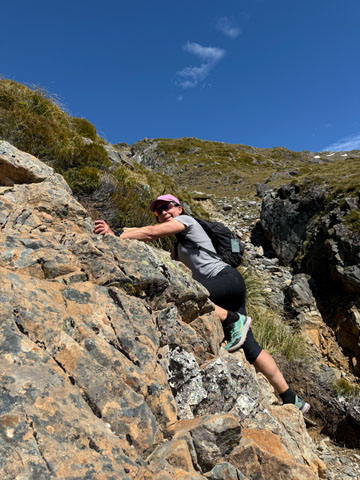Par la suite, le sentier est très rocheux, nous devons pratiquement escalader certains segments. Rapidement, la récompense arrive: les panoramas. Lorsqu’on prend le temps de lever les yeux du sol, la beauté qui s’offre à nous est indescriptible. Jamais une photo ne pourra rendre le sentiment d’allégresse qui nous envahit. Pendant l’ascension, nos discutons avec une jeune Française originaire du Cantal, la région familiale d’Hermine!